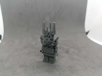 This design features the instantly recognizable minifigure form, outfitted with an intricate, custom-modeled helmet and armor pieces that capture the terrifying essence of the Dark Lord of Mordor. It is a perfect mash-up for fans of both building bricks and high fantasy, serving as an eye-catching centerpiece for any desk, shelf, or display case.