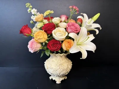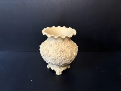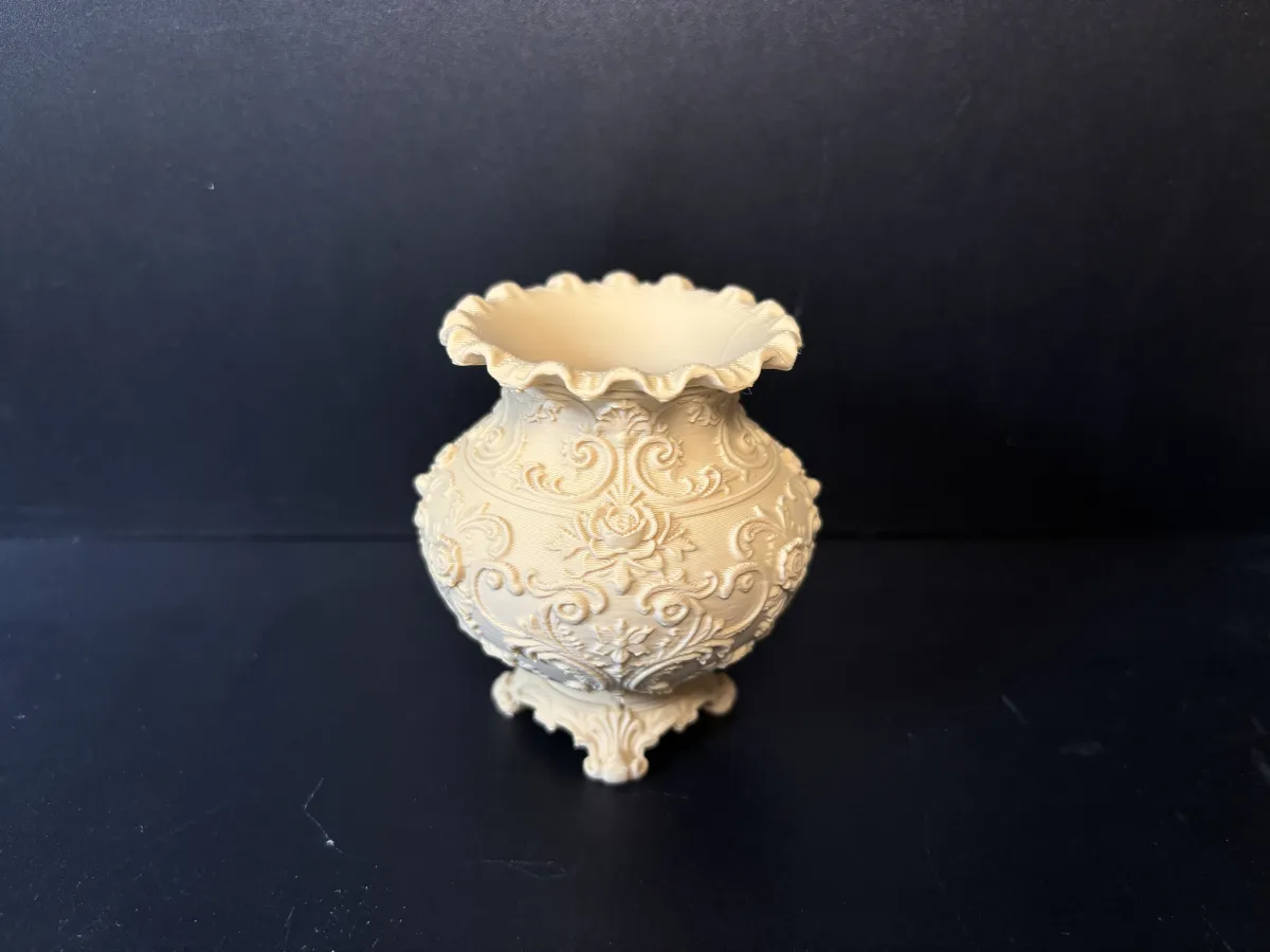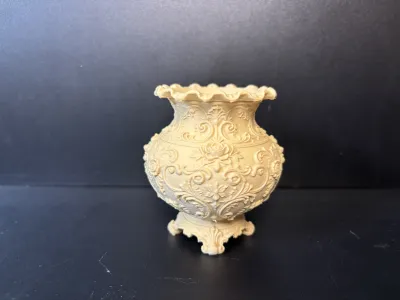 The bottle body features quintessential Baroque decorative elements, with the main surface entirely covered in three-dimensional relief sculptures dominated by scrolling foliage, swirling motifs, and rose blossoms. The intricate, graceful lines exude a strong Romantic aesthetic. The rim is designed with a wave-like lotus-leaf edge, complemented by a three-curved foot base adorned with scrolling foliage patterns. The overall form is full and opulent, capturing the elegant charm of classical porcelain. It can serve as a dried-flower vase or decorative piece, placed on a desk, vanity, or in the living room to infuse the space with a French vintage ambiance; alternatively, it can be used as a storage jar or pen holder for makeup brushes, stationery, or small accessories.
