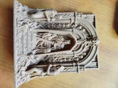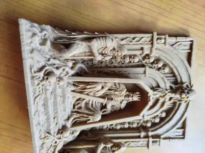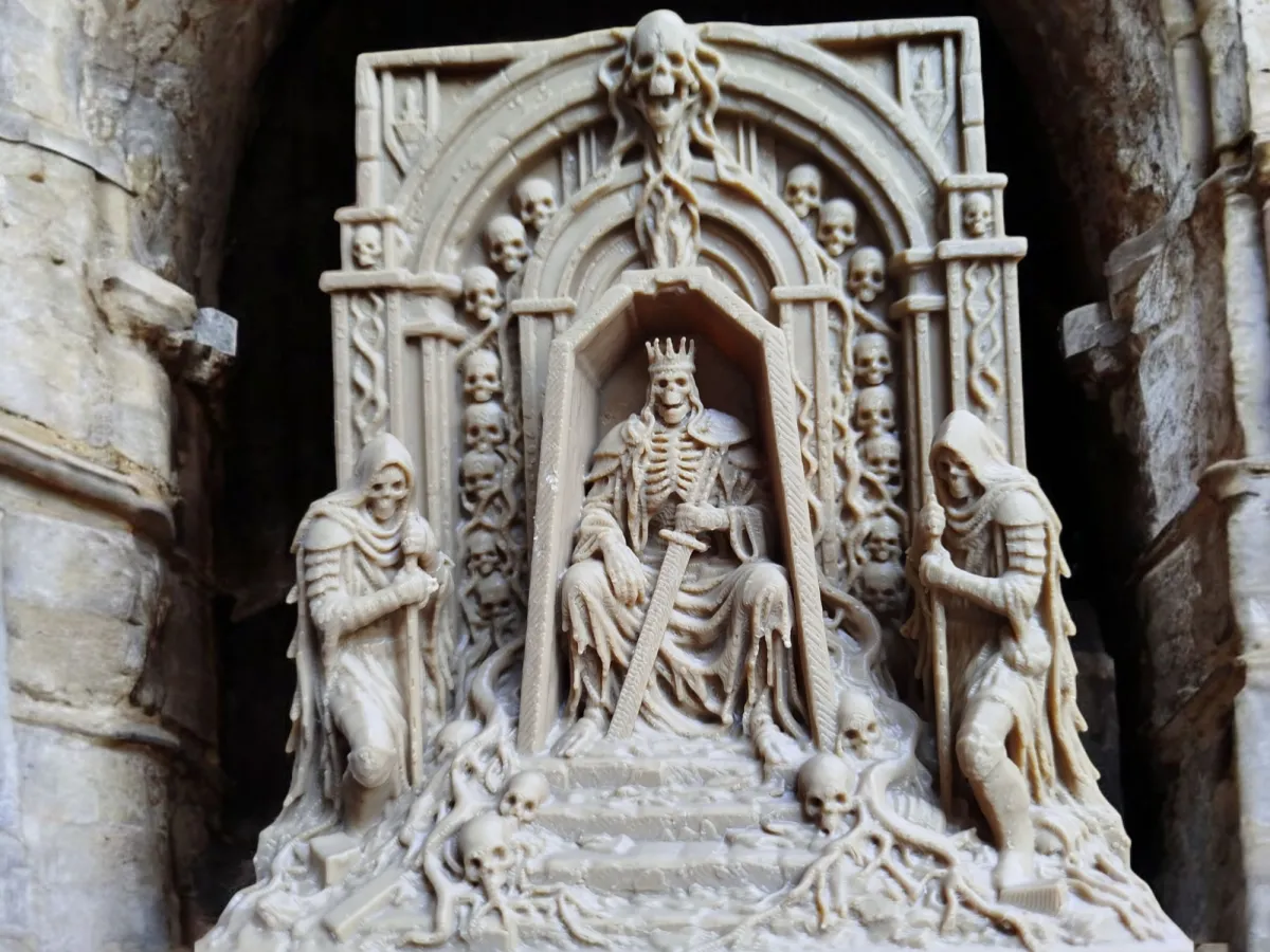 The Bone King Throne is a gothic relief capturing the eerie magnificence of a skeletal monarch seated in a throne surrounded by minion figures. It embodies the dark fantasy aesthetic cherished in gothic art.