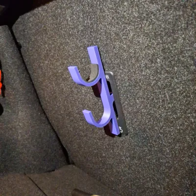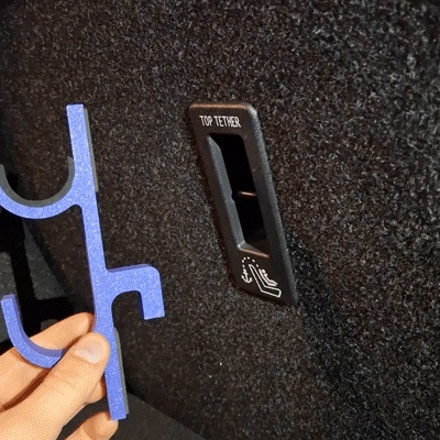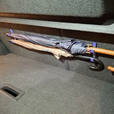 This clever 3D printed holder hooks directly onto the rear seat Top Tether anchor (Isofix child seat point) and keeps your umbrella fixed, tidy and always ready to grab.