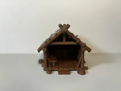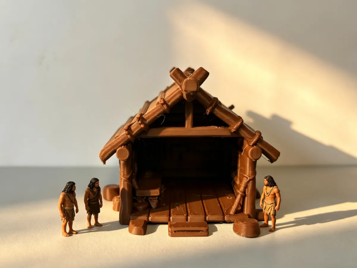 Replica of a Log Cabin Structure: Inspired by the construction of natural log cabins, this model faithfully recreates the classic aesthetic of primitive wooden dwellings—slanted roof trusses, tied beams and posts, and solid log columns. Every detail mimics the rough, handcrafted texture of traditional timber framing, transporting you straight back to a prehistoric tribe.