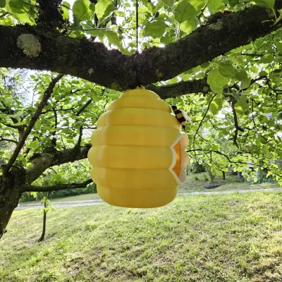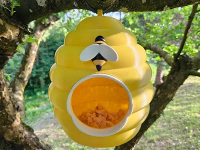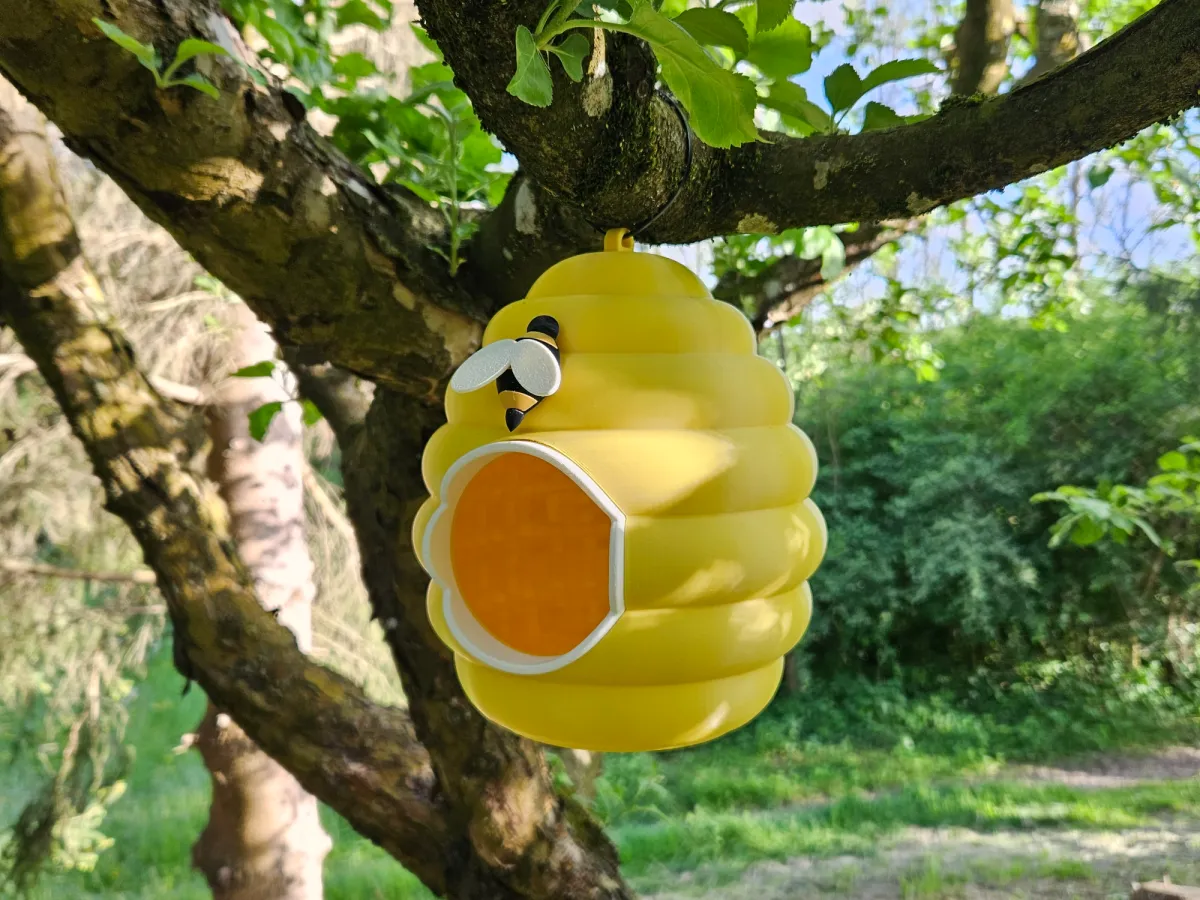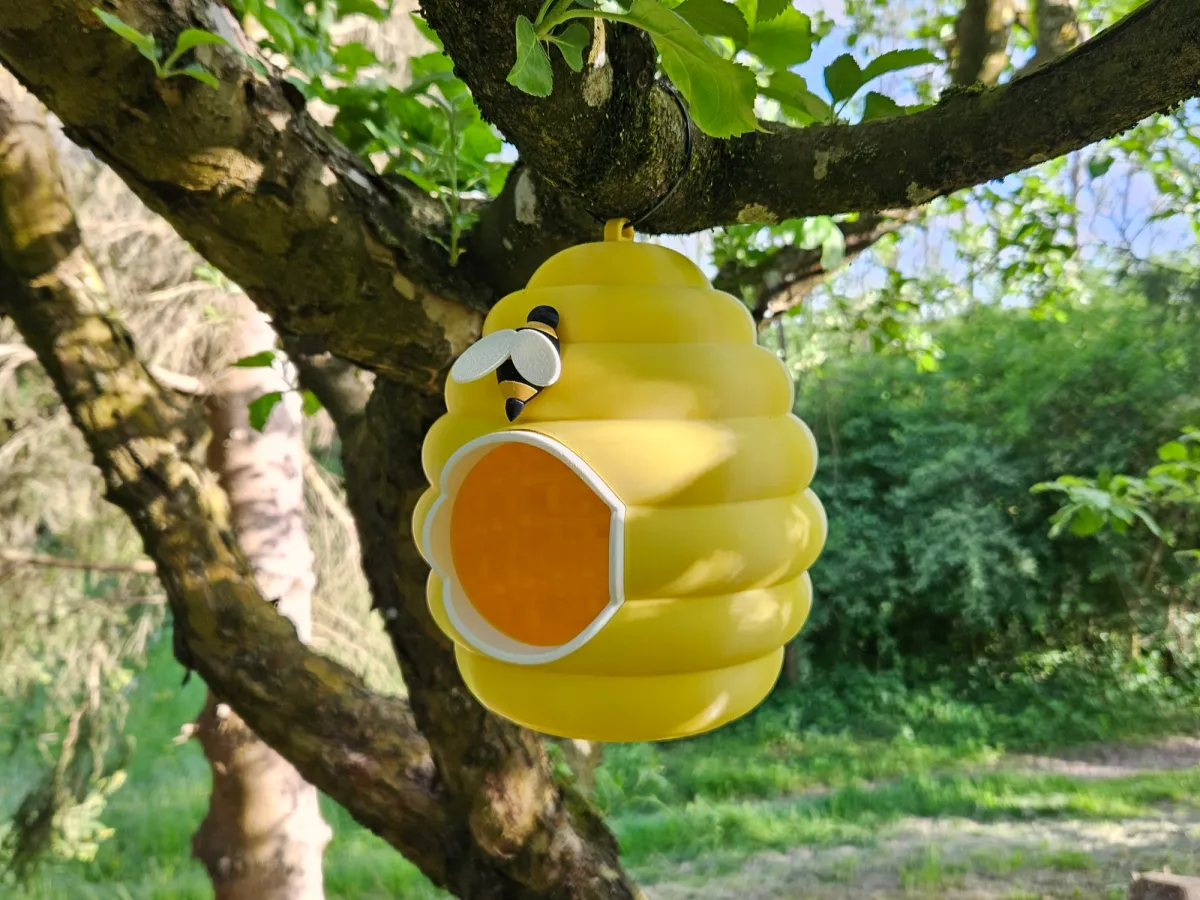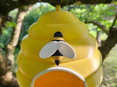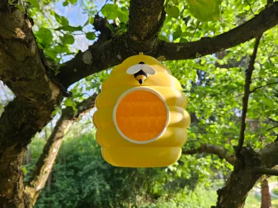 This is a 3D printed birdhouse in the shape of a beehive. To attach it to the tree, use a zip tie. For assembly you will need some glue (I used UHU Super glue). Glue the Entrance frame to the Beehive and a bee after assembling it.