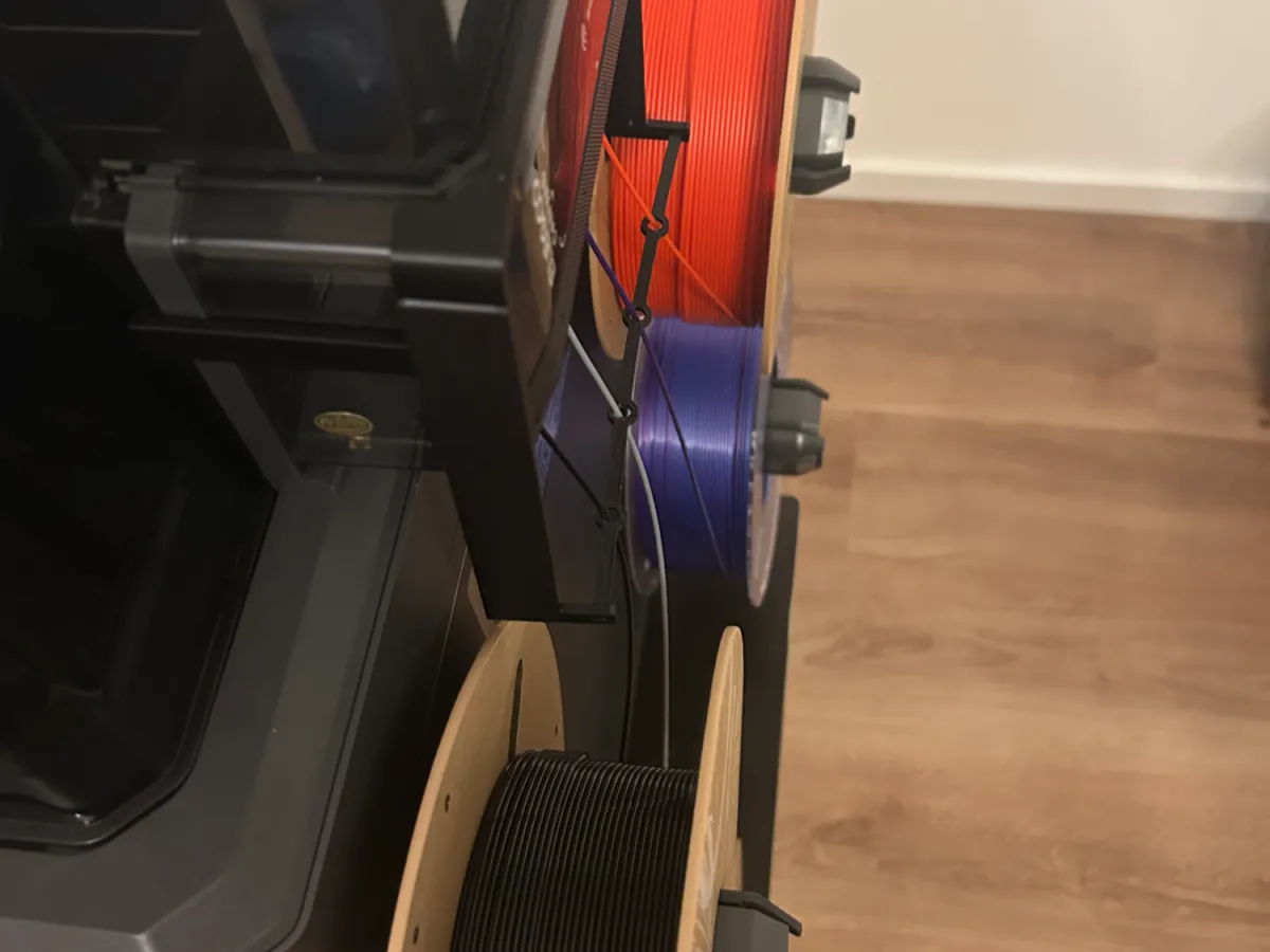 It moves the filament pull point lower and farther away from the printer, so the pulling force acts closer to the center of each spool instead of pulling strongly inward toward the printer.