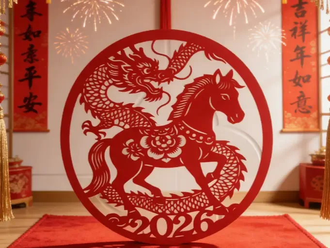 2026, the Year of the Horse—exclusive “Dragon-Horse Spirit” paper cuttings: As vibrant red hues flow and swirl, a majestic dragon clasps auspicious symbols while a swift steed heralds good fortune, encapsulating the heartfelt wish “May the dragon soar and the horse leap as we welcome the New Year, bringing blessings to every home and prosperity to all endeavors” within a single sheet of fiery red paper. These exquisite pieces not only add the perfect finishing touch to your festive celebrations but also make thoughtful, heartwarming gifts to convey well‑wishes to loved ones.