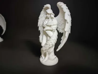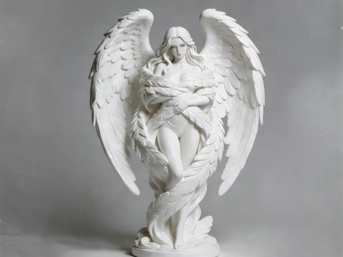 - Posture of the Figure: The angel is depicted in a softly curled, seated pose, with both arms gently wrapped around the chest. Her body is delicately enveloped in layers of feathers and flowing fabric, exuding an inward‑facing, serene demeanor that conveys a sense of quietude and protective care.