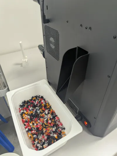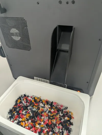 To complete the setup, you will need a collection bin (waste box) placed at the exit of the ramp. I personally use bins available at new-plastic.it, which fit perfectly with this rear-exit configuration.