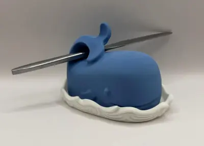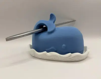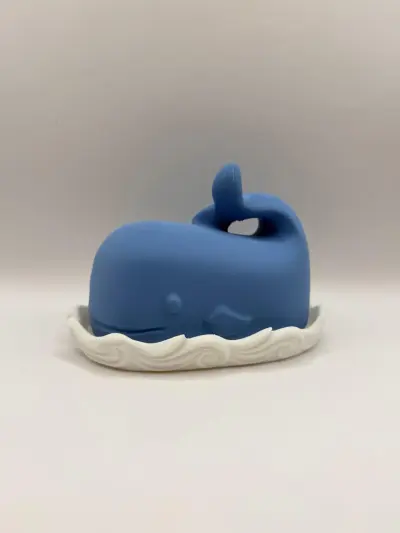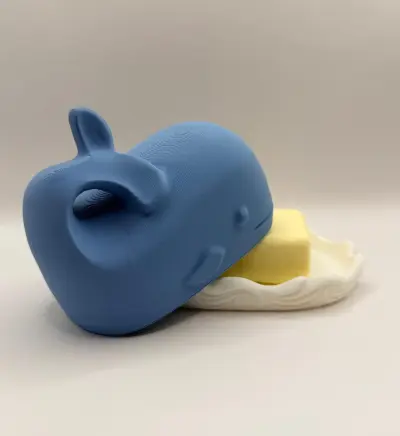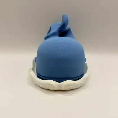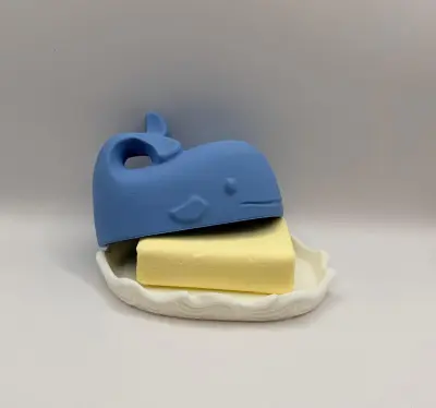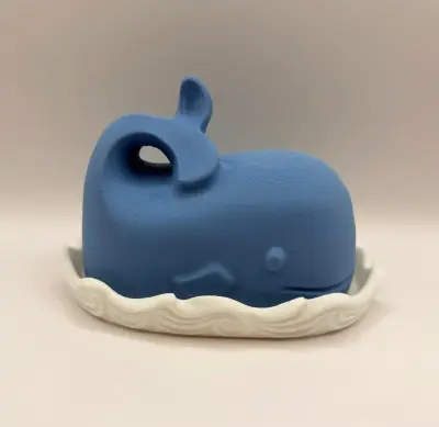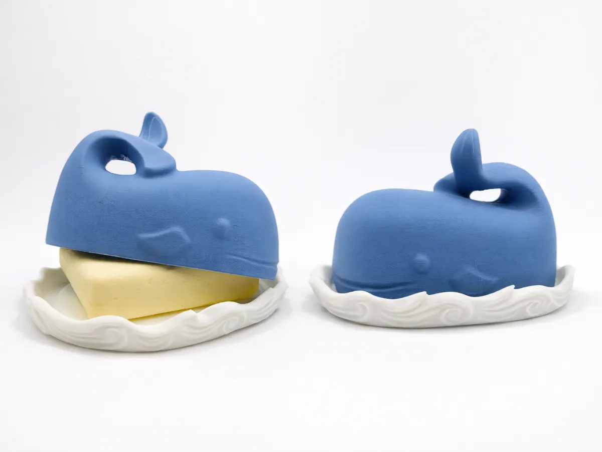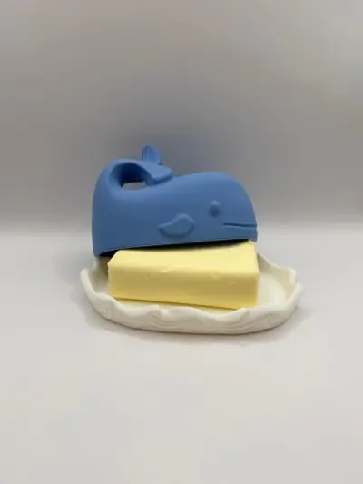 A unique and creative 3D-printed butter dish featuring a two-part design: a white base with a wave motif and a blue whale-shaped cover. The whale's tail serves as a functional handle for easy lifting. This accessory not only keeps your butter fresh but also acts as a charming centerpiece for your breakfast table. A stylish and functional gift for any kitchen.