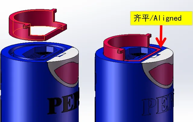 2. Install the buckle on the lower bottle with glue. The surface of the buckle shall be flush with the surface of the bottle body as far as possible, as indicated by the red arrow in the following figure. Otherwise, when the upper and lower bottles fit together, the gap may be too large;