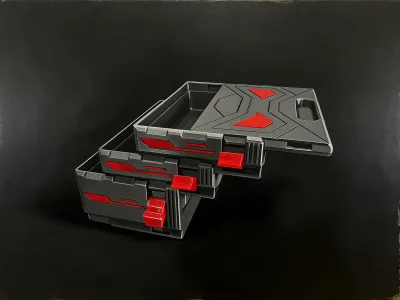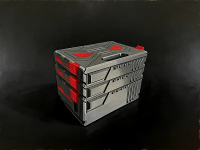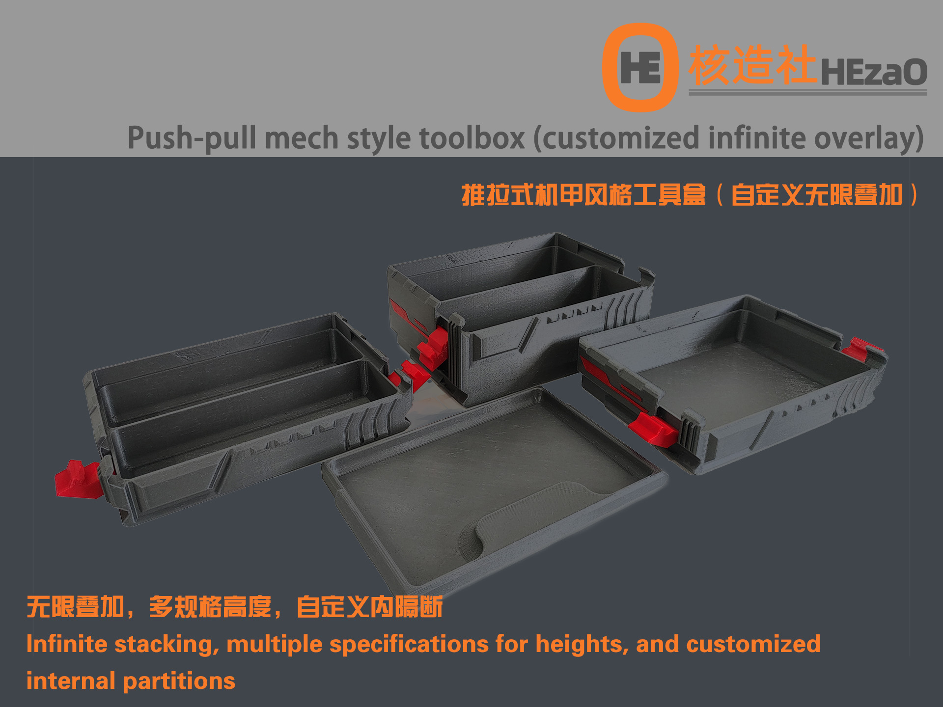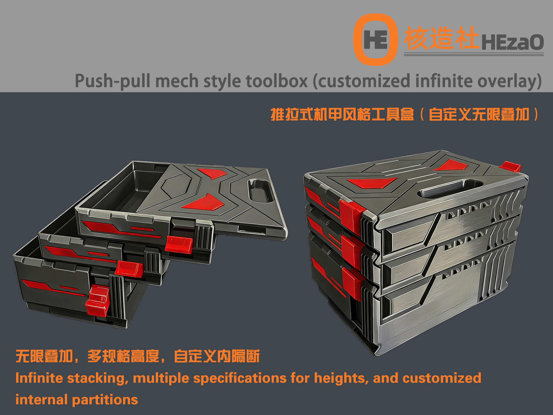 这是一款我精心设计的推拉式堆叠工具盒,外观采用机甲风格,可以无限叠加,卡扣锁紧,设计了多种规格内部高度:30cm、60cm、90cm、120cm、150cm,同时还设计了可编辑内隔断,可实现自定义内部空间的布局。
