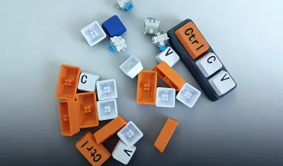 模型内置机械键盘轴体,按压时可获得清晰段落感与清脆按键声,兼具桌面摆件与解压玩具的双重属性。主体采用 3D 打印材质,以橙色 Ctrl 键、白色 C/V 键搭配深灰色底座的撞色设计,视觉辨识度高,结构紧凑便携。